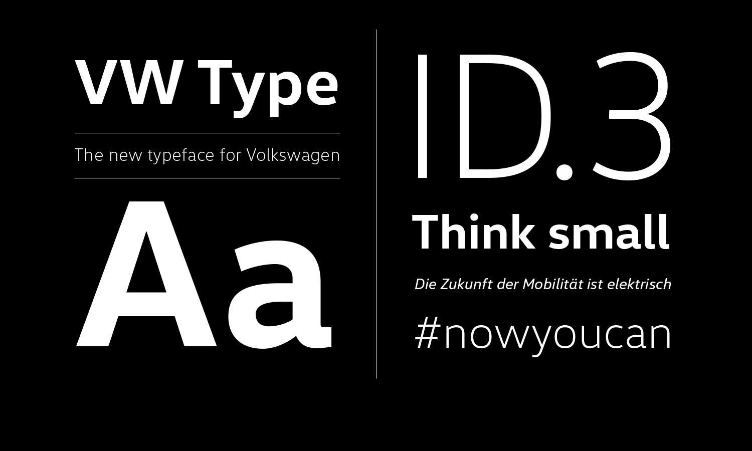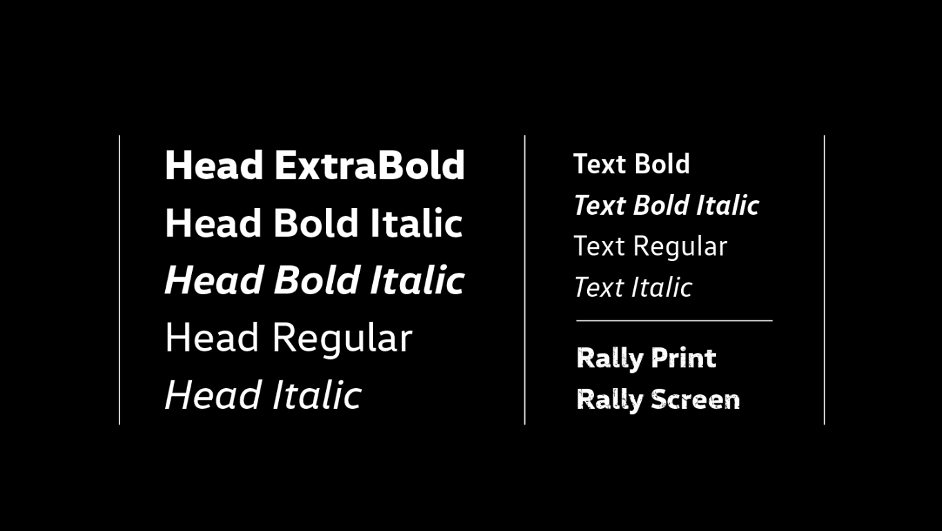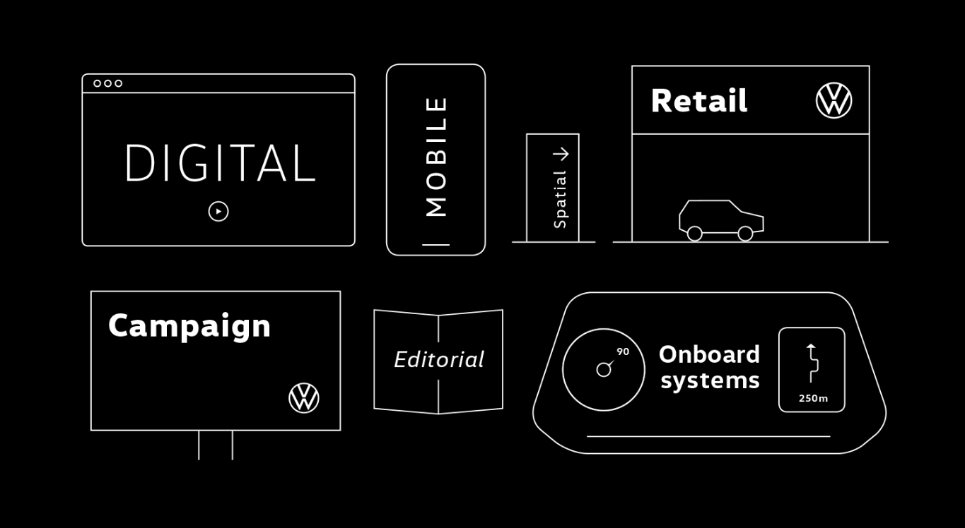 作为大众汽车重大品牌转型进程的一部分,我们与HvD字体公司合作,从零开始打造了全新定制字体:VW字体。该字体包含十一种样式,引领用户完成360度全方位体验——从广告、印刷、网页及空间设计,直至全数字化的车内体验。VW字体已在全球范围推广应用,成为2019年全新发布的大众品牌设计体系的核心组成部分。